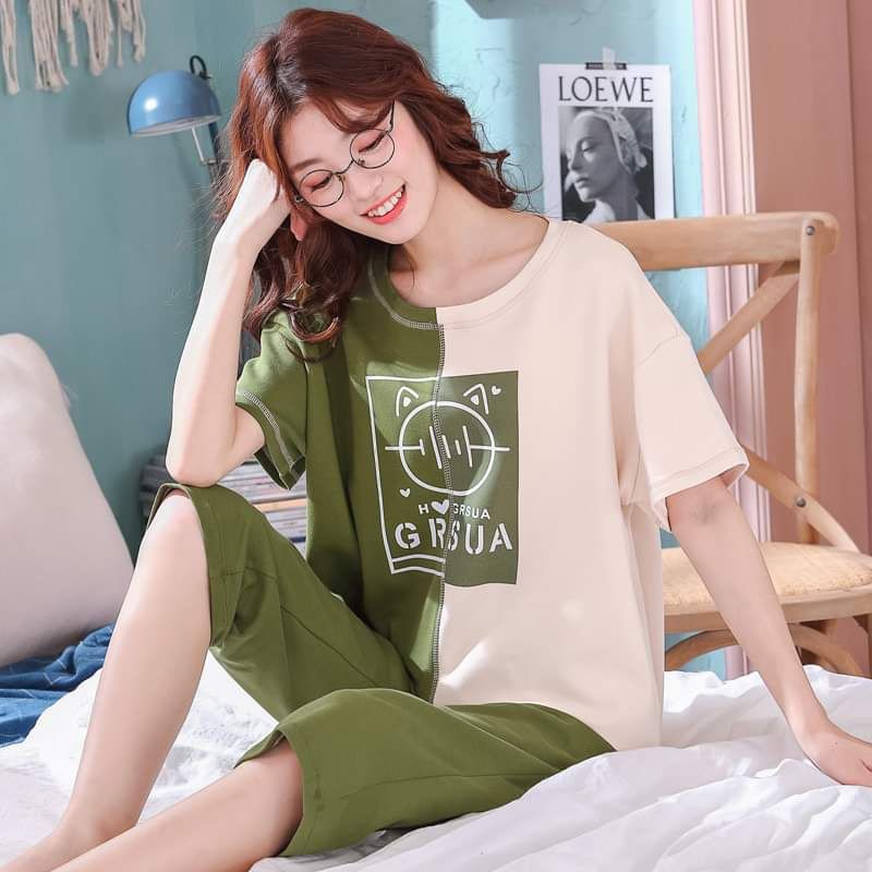 [Sẵn] Đồ bộ thun cotton quần dài, đồ mặc ở nhà Quảng Châu, họa tiết hoạt hình dễ thương