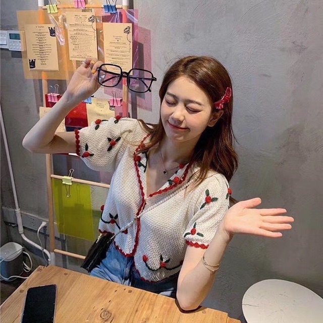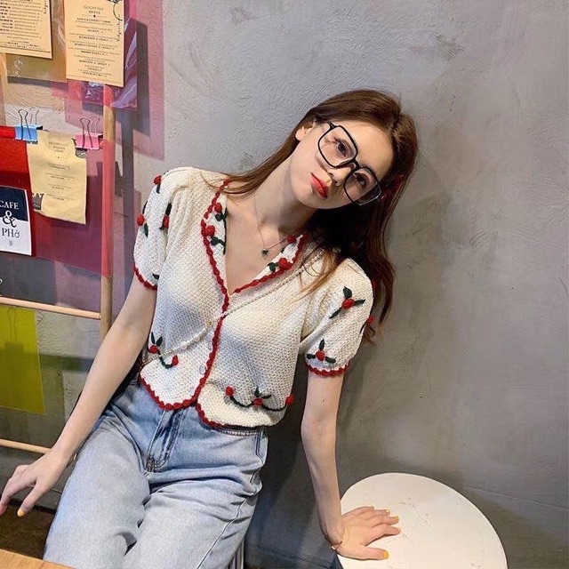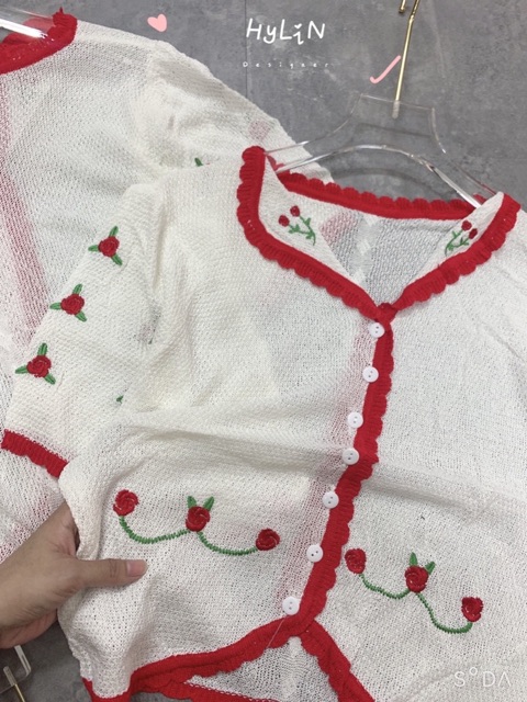 ÁO LEN CROPTOP THÊU HOA VIỀN ĐỎ