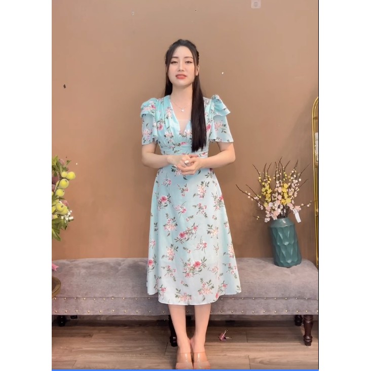 Váy hoa cổ V, cổ V tay cánh, V tay cánh tiên, Monoco- Váy hoa cổ, tay cánh tiên -, hoa cổ V tay