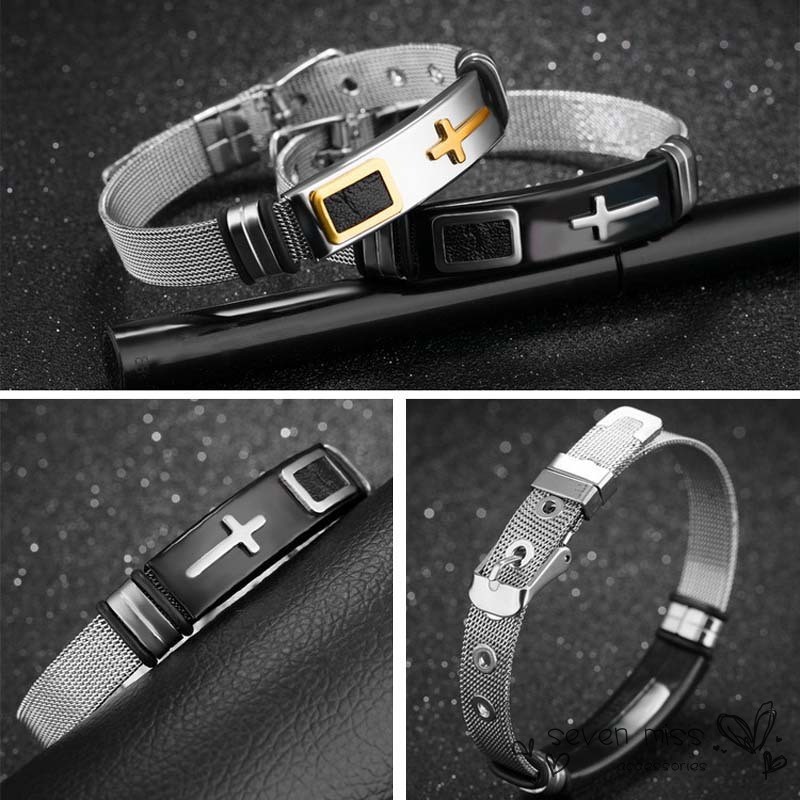 Vòng Tay Hai Sợi Bằng Thép Titan Mặt Hình Cây Và Thánh Giá Phong Cách Hip Hop